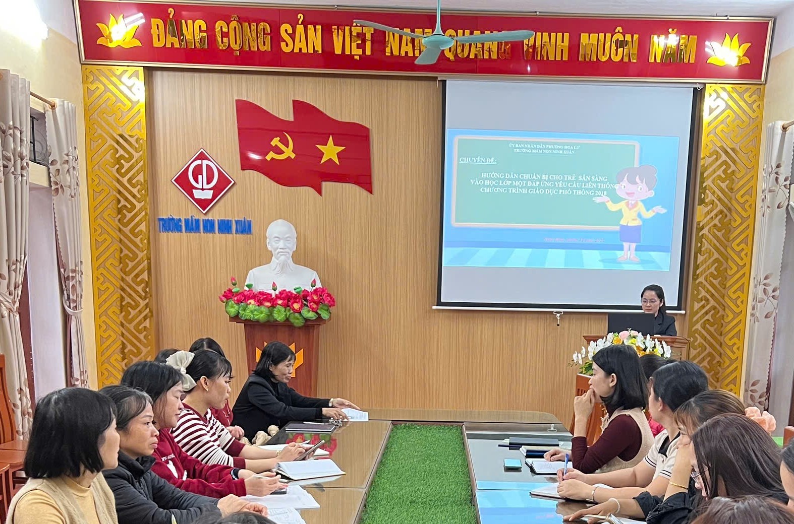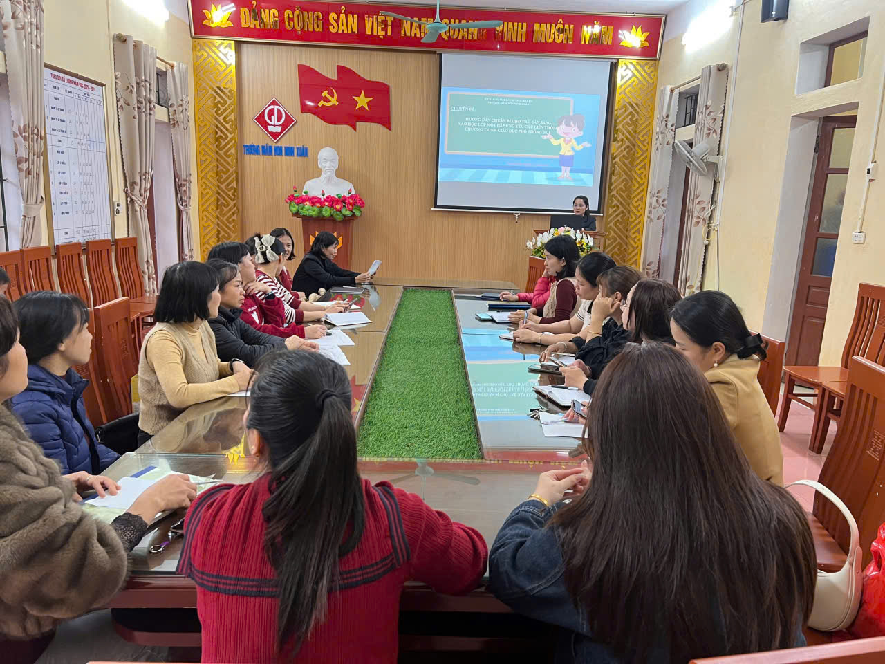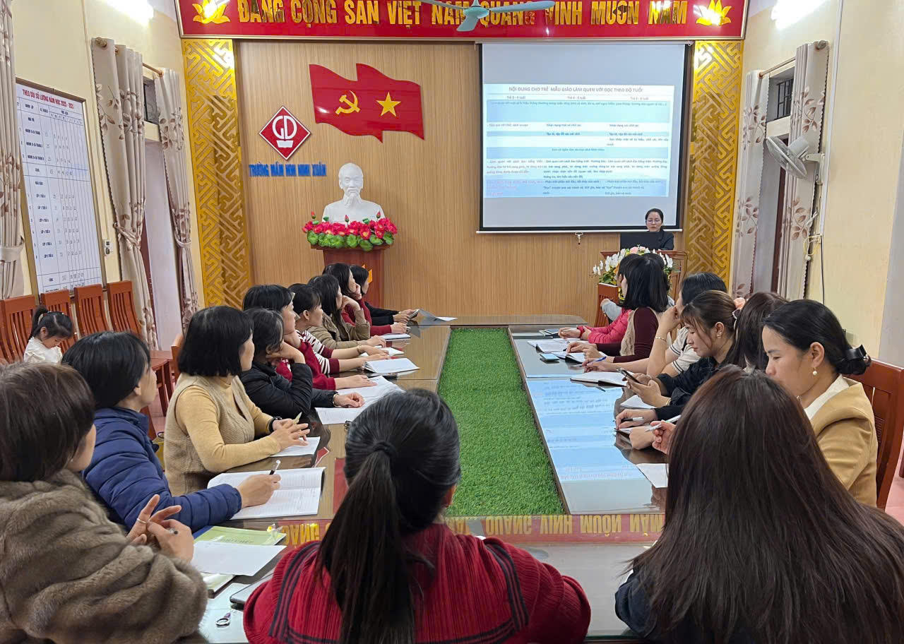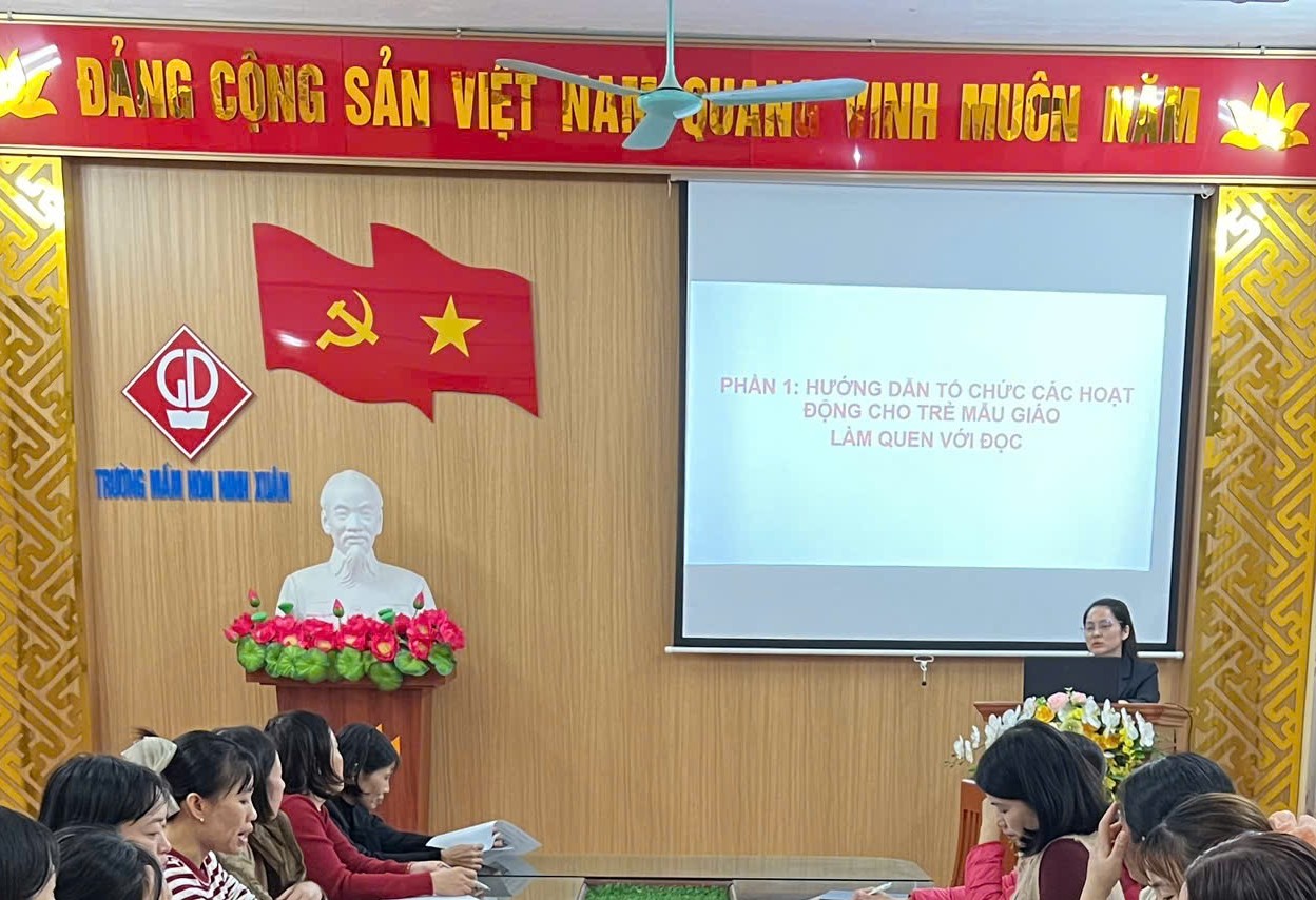 Chiều ngày 16/12/2025 Trường Mầm non Ninh Xuân đã tổ chức buổi tập huấn “Hướng dẫn chuẩn bị cho trẻ sẵn sàng vào học lớp 1 đáp ứng yêu cầu liên thông chương trình GDPT”. Buổi tập huấn tập trung làm rõ mục tiêu, nội dung và phương pháp giáo dục phù hợp với đặc điểm tâm sinh lý trẻ, chú trọng phát triển kỹ năng nền tảng và tâm thế vững vàng cho trẻ khi bước vào bậc tiểu học. Thông qua trao đổi, thảo luận và chia sẻ kinh nghiệm thực tiễn, giáo viên được nâng cao năng lực tổ chức các hoạt động giáo dục hiệu quả. Hoạt động tập huấn góp phần đảm bảo sự thống nhất trong công tác chuyên môn và nâng cao chất lượng giáo dục của nhà trường.